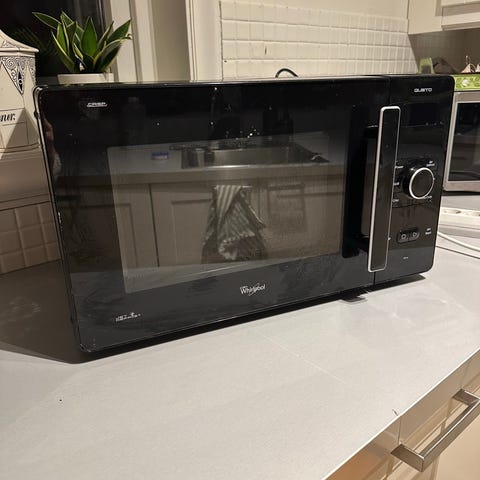 Whirlpool mikrobølgeovn i hvit farge. Frittstående modell med frontåpning og sidehengslet dør. Innvendig rom med dreietallerken og enkel betjening via knapp og dreiebryter på høyre side. Passer til oppvarming og tining av mat på kjøkkenbenk eller lignende underlag.