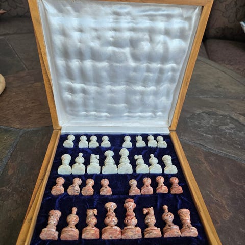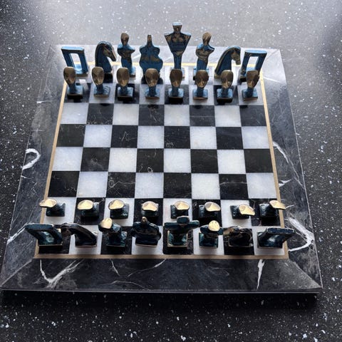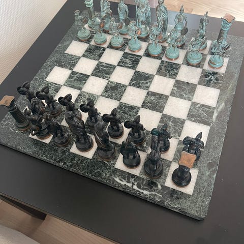 Sjakksett sjakkspill med brett og brikker i marmor. Brettet har rutemønster i grå og hvit marmor med ramme i mørkere marmor. Brikkene er utformet i to farger, lys/hvit og mørk/grå marmor. Settet egner seg til vanlig sjakkspill og kan også brukes som dekorativt innslag i hjemmet. komplett sett brikker og tilhørende brett slik det vises på bildene.