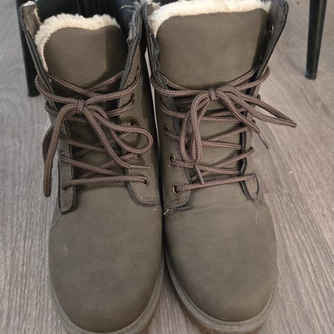 Adventure Footwear vinterstøvler i størrelse 38. Støvlene er grå med lys, kraftig yttersåle i gummi og grovt mønster for godt grep. Overdelen har snøring med metallhemper og tekstilkant rundt ankelen. Innvendig er støvlene fôret med mykt, lyst teddyfôr som gir ekstra isolasjon. Egnet som vinterfottøy til hverdagsbruk og tur i kaldt vær.