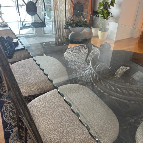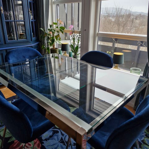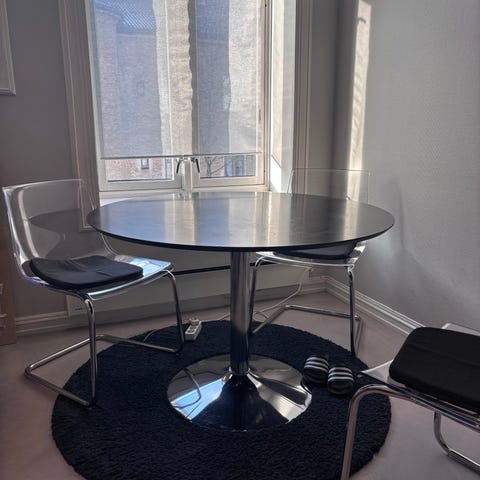 Pent brukt spise bord med seks stoler selges samlet. Må hentes