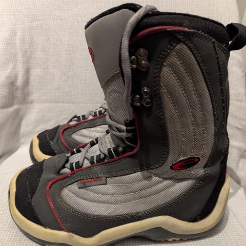Sims Arc Edge snowboardstøvler i størrelse EU 34,5 (US 3 / JPN 210). Støvlene har snøring foran og hempe bak for enklere av- og påtaking. Fargekombinasjon svart, rød og grå. Egnet til bruk med standard snowboardbindinger i riktig størrelse. Passer til barn eller personer med tilsvarende skostørrelse som ønsker faste og støttende snowboardstøvler.