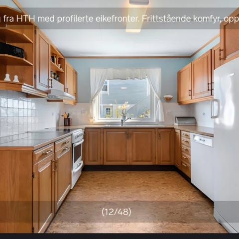 Kjøkkeninnredning i lys trefarge med overskap, underskap og høyskap L-form, ca mål: 3.77 x2.92 m. Innredningen består av flere skap med hyller, skuffer og integrert plass til komfyr, oppvaskmaskin. (Kun oppvaskmaskin følger med) Overskapene har innvendige hyller for oppbevaring av servise og kjøkkenutstyr. Underskapene har både skuffer og skaprom, og det er benkeplate i hel lengde langs veggen. Det følger med vaskekum og blandebatteri montert i benkeplaten. Frontene har enkle håndtak i metall. Innredningen egner seg til montering i rett kjøkkenløsning langs vegg, som vist på bildene. Ingen kjente skader. Pris kan diskuteres ved rask og enkel handel. Må demonteres og hentes av kjøper mellom 21 og 24 februar.