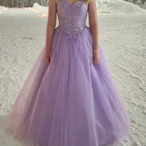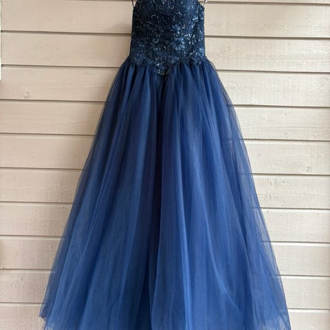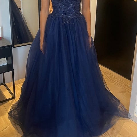 Flott mørkeblå ballkjole str S-M med regulerbar rygg. Brukt i kun 4 t. Selges kr 3500