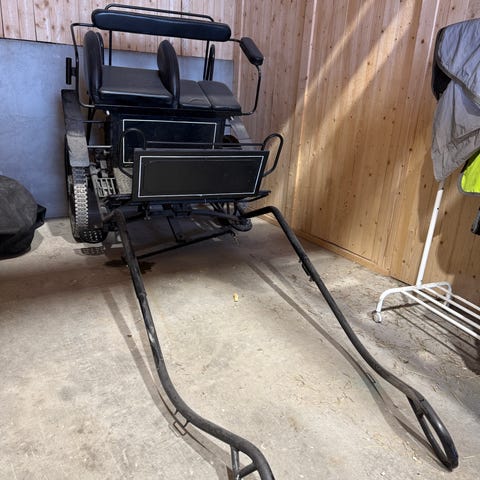 Hestevogn tohjuls kjørevogn i svart utførelse med polstret sete, ryggstøtte og brems. Vognen har store hjul med gummidekk, skjerm over hjulene og fotbrett for kusk. Den er utstyrt med drag foran for innfesting til hest og har plass til to personer på setebenken. Egnet til kjøring med hest på vei eller bane, samt trening og turkjøring.