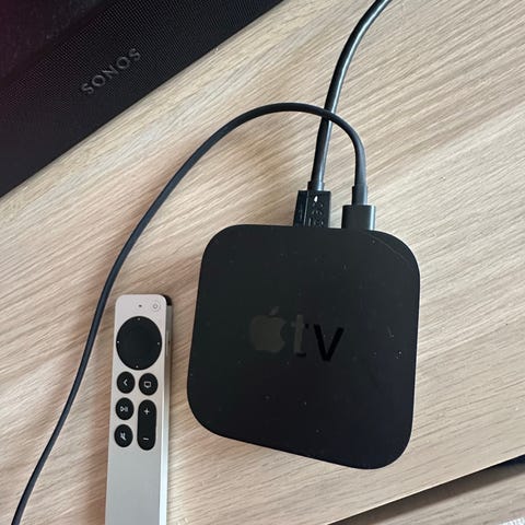 Apple TV med fjernkontroll og strømkabel. Enheten kobles til TV via HDMI (ikke vist på bildet) og gir tilgang til strømmetjenester og annet innhold, avhengig av hvilke apper som støttes av programvaren. Strømkabel følger med, samt fjernkontroll for navigasjon i menyer og avspilling av innhold.