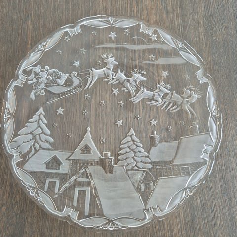 Glassbolle med julemotiv og tre bein, produsert av Walther Glass. Mikasa "Night before Santa" krystall glass.