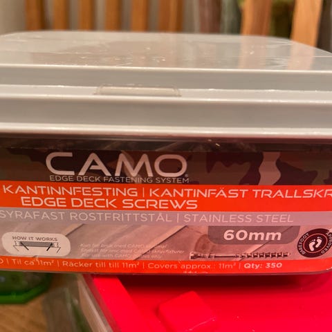 Settet består av et CAMO Marksman Pro NB5 verktøy for skjult innfesting av terrassebord fra siden, samt CAMO Edge Deck terrasseskruer på 60 mm. Verktøyet er beregnet for montering av terrassebord med skjult skruing i kanten av bordet. Skruene er tilpasset systemet og brukes sammen med verktøyet for korrekt avstand og innfesting. Kan ikke finne noen kvittering