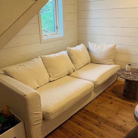 Godt brukt sofa i hvit, synlig brukt med nytt trekk i grått. Må hentes