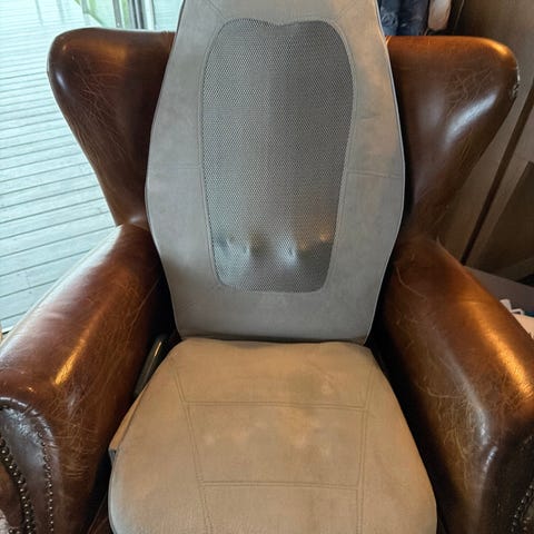 OBH Nordica massasjesete med fjernkontroll. Setet er utformet som et rygg- og setetrekk som kan plasseres i en stol. Det har integrerte massasjehoder i ryggen og setet, samt lysfunksjon. Fjernkontrollen gir mulighet til å velge ulike massasjeprogrammer, intensitet og områder på ryggen. Setet festes med stropper rundt stolryggen, og drives via strømtilkobling med ledning. Egner seg til bruk i vanlig stol eller lenestol for punktvis og generell rygg- og setemassasje. Orginale prisen er 2000kr