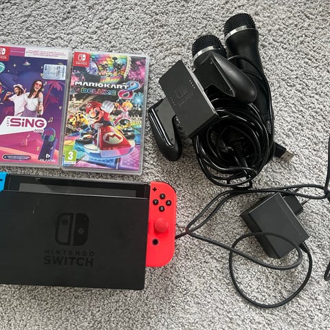 Nintendo Switch konsoll med tilhørende Joy-Con kontroller i rød og blå farge. Inkluderer dock for tilkobling til TV, bæreremse, lader, og bæreveske for transport og oppbevaring.