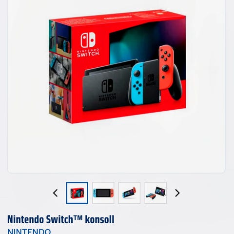 Nintendo Switch selges med diverse tilbehør. Skjermen har skjermbeskytter på seg.