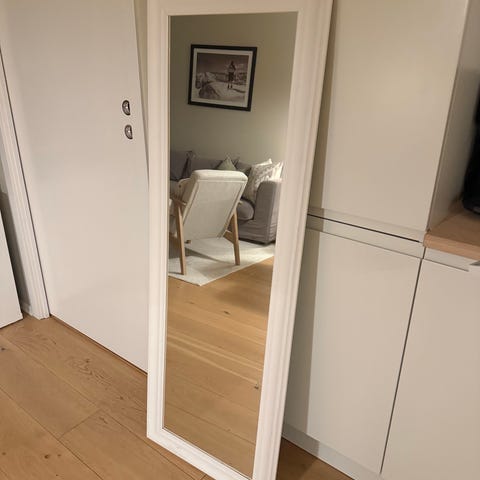 IKEA speil med hvit ramme. Rektangulært speil som kan brukes som helfigurspeil i gang, soverom eller andre rom. Rammen er smal og lys, og speilet kan henges på vegg eller plasseres stående inntil vegg etter behov.
