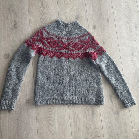Hjemmestrikka grangenser fra Klompelompe. St ca 6 år. Brukt av ei jente. Er pent brukt og i god stand. Ingen hull eller slitasje.