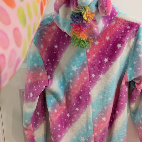 Supersøt Unicorn onepiece str 128. Lys turkis med gullstjerner og flerfarget manke. Fine paljett detaljer på ørene og søte vinger på ryggen. Kan brukes som kosedress eller på karneval.