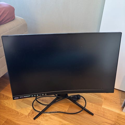 Samsung C27F390FHU skjerm med buet panel og skjermstørrelse på 28 tommer. Skjermen har HDMI-inngang ifølge merkingen på baksiden. Foten er V-formet og i svart farge, og skjermen har et slankt design som egner seg til bruk på skrivebord. Passer til generell PC-bruk, kontorarbeid og underholdning, avhengig av tilkoblet utstyr og spesifikasjoner fra produsent.