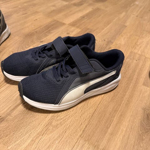 Puma joggesko for barn i størrelse 35. Skoene er unisex og har overdel i tekstil i marineblå farge med hvit såle. Modellen har to borrelåsstropper over vristen for enkel av- og påkledning. Yttersålen er i gummi med mønster som gir godt grep.