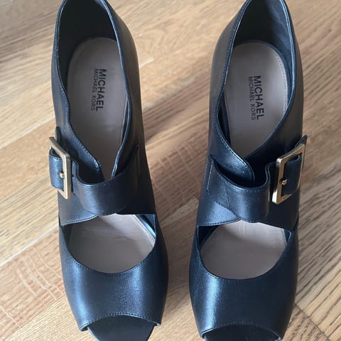 Michael Kors hæler i størrelse 37 for dame. Skoene er i svart skinn med åpen tå og hæl, samt snøring bak ankelen. De har høy, smal hæl og glidelås i siden for enklere av- og påtaking. Passer til bruk ved mer formelle anledninger eller når man ønsker et mer pyntet uttrykk.
