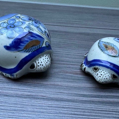 Keramikkfigurer formet som skilpadder.