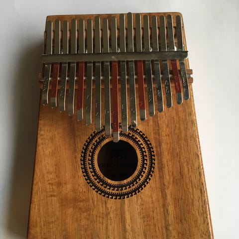 Kalimbaen leveres med stemmehammer, klistremerker for merking av toner, bruksanvisning og oppbevaringspose.