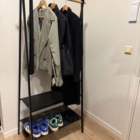 5 svarte kleshengere og den grå tøyhylla fra IKEA kan følge med gratis hvis ønskelig.