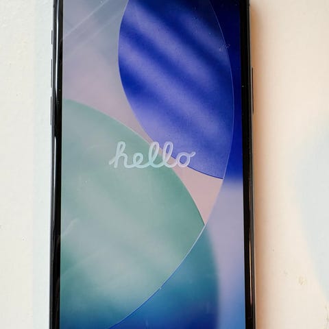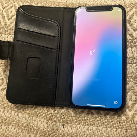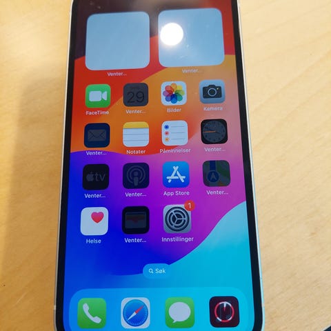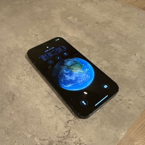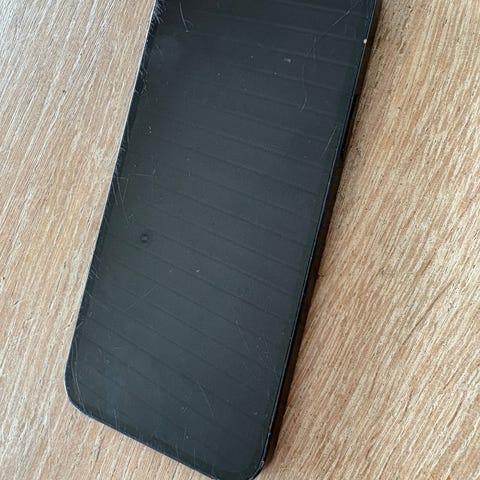 Apple iPhone 12 mobiltelefon med 64 GB lagringsplass. Skjermen har synlige riper og sprekk, som vist på bildene. Alt skal fungere på den. Synlig brukt