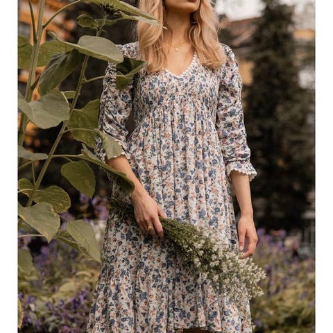 Nydelig beige kjole med blått blomsterprint. Kniplinger på ermene og volangdetaljer nederst. Pent brukt en gang