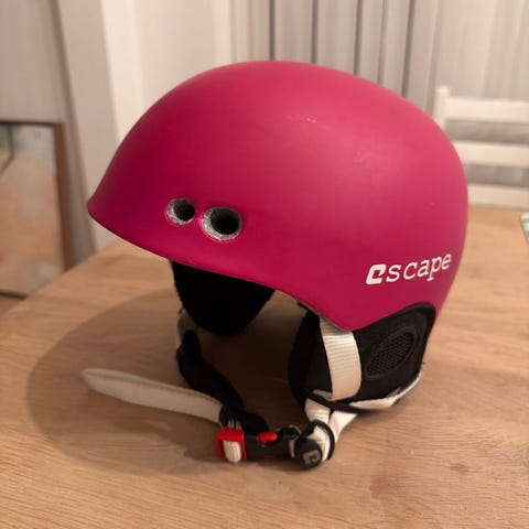 Escape hjelm i rosa farge. Hjelmen har hardt ytterskall med ventilasjonshull foran og på sidene, samt justerbar hakestropp med klips. Egnet som beskyttelseshjelm til aktiviteter som krever hodebeskyttelse, for eksempel sykkel, skate eller lignende, avhengig av godkjenning og størrelse.