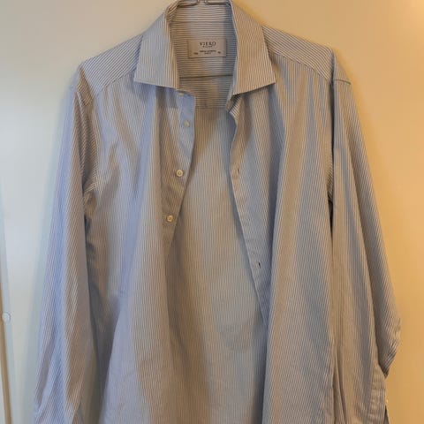 Tiger of Sweden skjorte for herre i størrelse (42) L. Skjorten er lyseblå og laget av bomull. Klassisk modell med krage og lange ermer, samt knepping i front og ved mansjettene. Egnet til både hverdagsbruk og mer formelle anledninger. Vask- og vedlikeholdsinformasjon står på innvendig merkelapp.