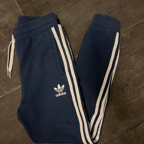 Mellomblå med hvite striper. Adidas str 146, pent brukt! Ingen nupper og praktiske lommer med glidelås