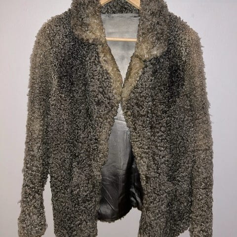 Kjempetøff og stilig retro pels. Ekte lammerull. Finsk kvalitet. God hette og lommer i sidene. Fargen går fra lys til mellomgrå.