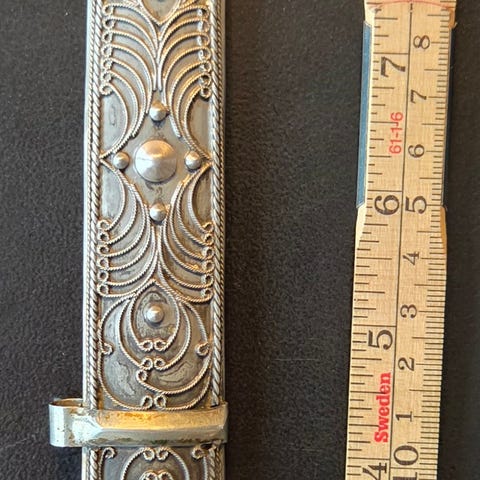 Selger en vintage gaucho kniv. Jeg har ikke funnet noe stempel, men ser ut som sølv med noen gullbelagte detaljer innimellom. Kniven er skarp.
