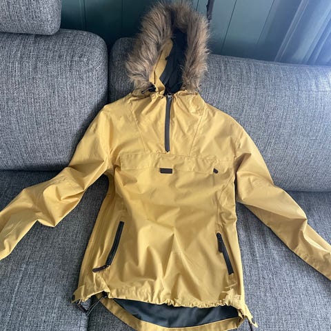 Anurakken har tre lommer, hete m/pelskrage og svarte knapper.