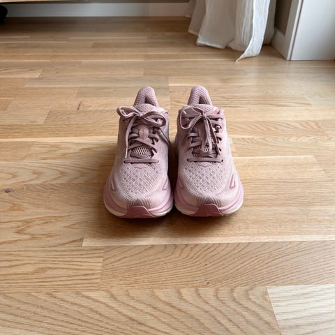 Hoka Bondi 8 joggesko i størrelse 39,5. Modellen har overdel i pustende mesh i blåfarge med Hoka-logo i rosa. Mellomsålen er kraftig dempet i lys blå/hvit farge, og yttersålen har gule gummipartier for grep. Skoene har snøring foran og hempe bak for enklere av- og påtaking. Egnet som joggesko og til hverdagsbruk der det er behov for godt dempet sko.