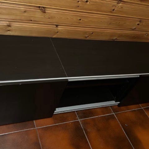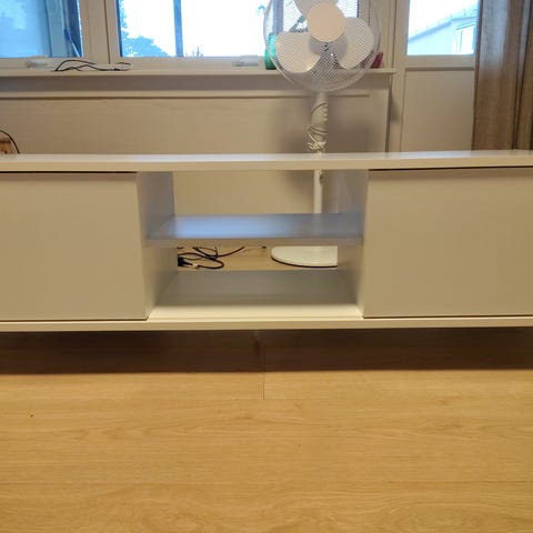 Tv benk med skuffer og glass hyller gies bort.