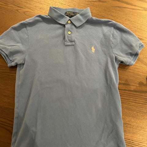 Ralph Lauren Polo pique t-skjorte for herre i størrelse M. Modellen er slim fit med kort erm og klassisk krage med knappestolpe. Fargen er blå. Plagget er hovedsakelig laget av bomull med noe elastan for stretch og bedre passform. Egnet til hverdagsbruk og fritid.