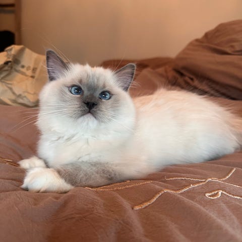 Timo er en blanding av maine coon og ragdoll. Født 10.07.2021. Han er ikke døv. Elsker kos og oppmærksomhet, har mye energi og sier ifra selv når han trenger noe (do, mat, vil ut) kjempesnill og nysgjerrig, han er kastrert, skippet og vaksinert. Hærlige blå øyne og hvit myk pels. Han har kattepass og veterinærkort som føller med.