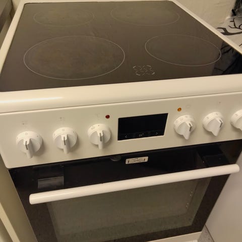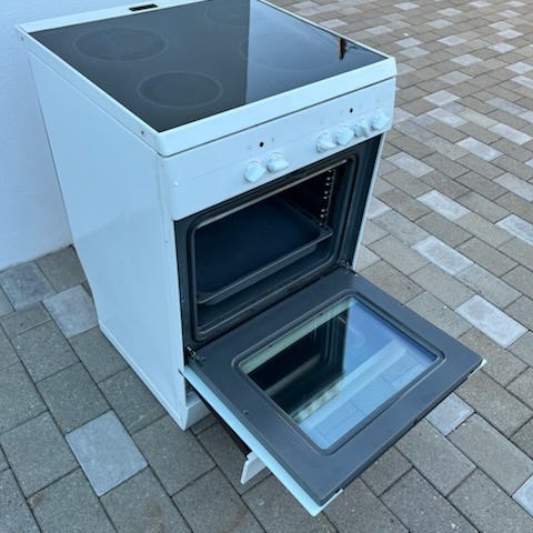 Gram keramisk komfyr med platetopp med fire kokesoner og stekeovn med glassdør. Komfyren har manuelle knotter for betjening av både koketopp og stekeovn. Egner seg til vanlig matlaging på kjøkken i leilighet, hus eller hybel. Strømkabel følger med slik den vises på bildene.