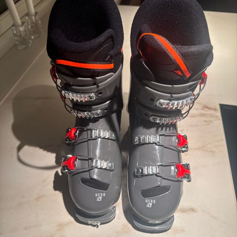 Head Z2 alpinstøvler for barn i grå og rød farge. Støvlene har tre spenner i front for justering og god tilpasning rundt foten. Str 215 255mm, ca 34 i sko str.