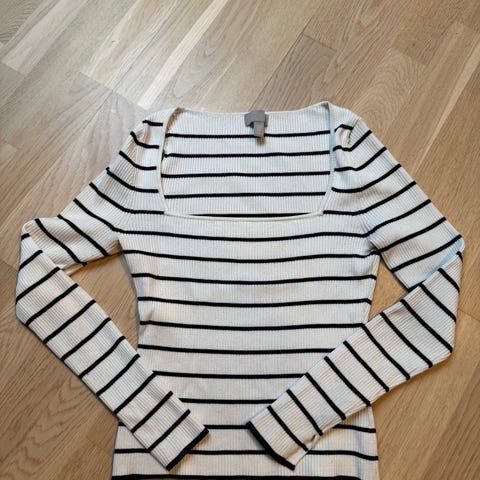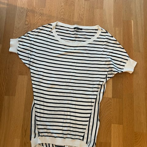 Gant topp for dame i størrelse S. Toppen er i ribbestrikket viskoseblanding med horisontale striper i blått og hvitt. Modellen har korte ermer og vid, båthals-lignende utringning. Materialet består hovedsakelig av viskose.