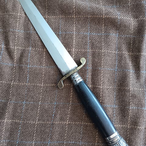 Jeg selger en eldre russisk jaktkniv, det står gravert "zlatoust" på bladet. Ca 1/3 av bladet mot tuppen er skarpt. Det er litt slark i håndtaket, men det kan nok strammes opp. Håndtak laget i horn.