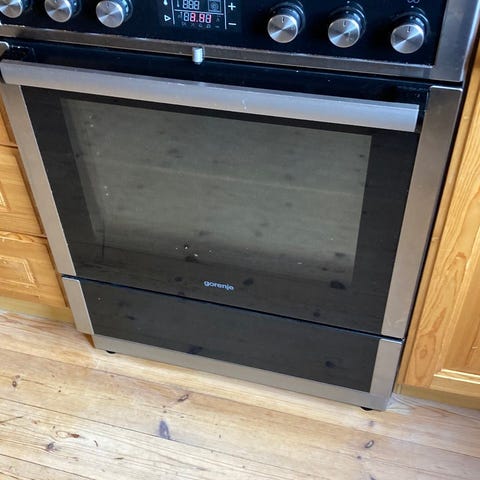 Gram induksjonskomfyr med platetopp og stekeovn. Komfyren har induksjonstopp med flere kokesoner og integrert stekeovn med glassdør. Front i stål og svart glass. Passer til frittstående plassering mellom kjøkkeninnredning.
