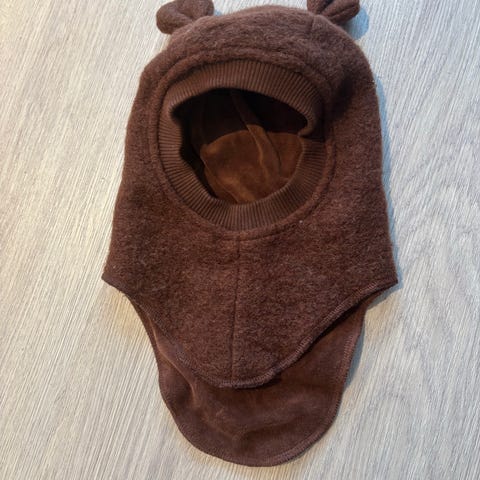 HUTTEliHUT ull balaklava for barn i størrelse 0-1 Balaklavaen er i brun ull og passer som unisex-plagg. Modellen dekker hode, hals og deler av brystet for ekstra varme. Egnet til bruk i kaldere vær og kan brukes under yttertøy ved utelek og trilleturer.