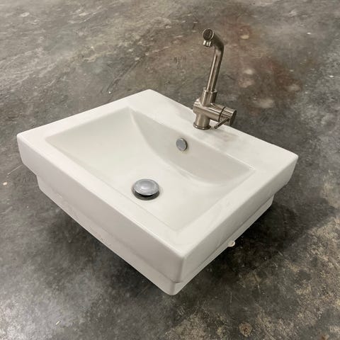 Vegghengt servant i hvit keramikk. Denne er noen år gammel men har ingen bruksmerker.