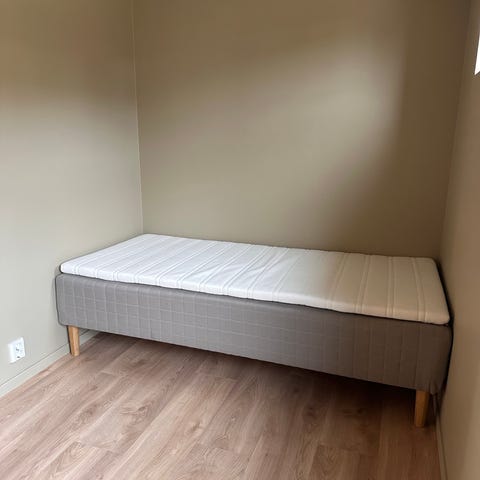 IKEA seng uten overmadrass, har alltid brukt overmadrass når jeg har sovet på den. Madrassen har synlige flekker, som vist på bildene.