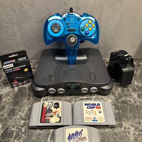 N64 konsoll med strømforsyning, AV kabel med Scart overgang, kontroll med slitt joystick og 3 spill