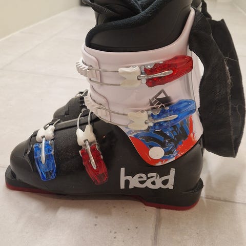Head alpinstøvler i størrelse 25.0/25.5, tilsvarer str. 39/40. Støvlene har hard ytterskall i plast med svart underdel og hvit skaftdel, samt grafiske detaljer i flere farger. Utstyrt med fire justerbare spenner for god tilpasning rundt fot og legg.