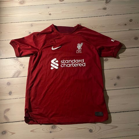 Liverpool FC fotballdrakt for herre i størrelse XS. Drakten er rød med hvite detaljer i hals og ermer. Offisiell klubbdrakt med Liverpool FC-logo på brystet og trykte sponsorer foran og på erme. Egnet til fotballspill, trening eller som supportereffekt.