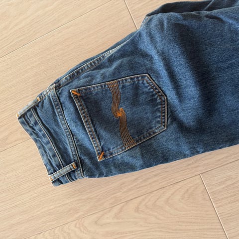 Nudie Jeans jeans i blå denim/ dongeri. Buksen har ca. størrelse XS/S: W27 og L32.