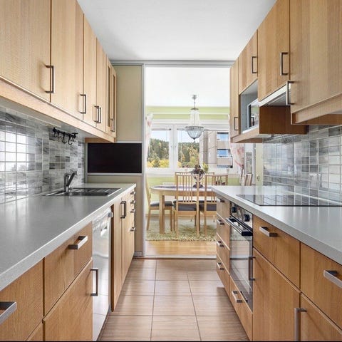 Kjøkkenet har profilerte heltre fronter og holder gjennomgående solid kvalitet. Til tross for alder fremstår det som svært godt vedlikeholdt og fullt funksjonelt.