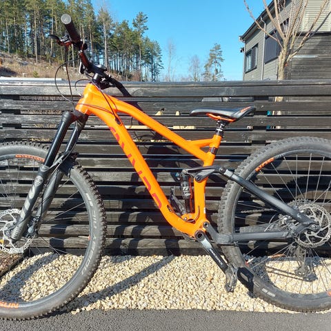 Denne sykkelen har ei lett aluminiumsramme, dropper post, nye nesten ubrukte dekk (Maxxis assegai framme og Maxxis DHR2 bak).